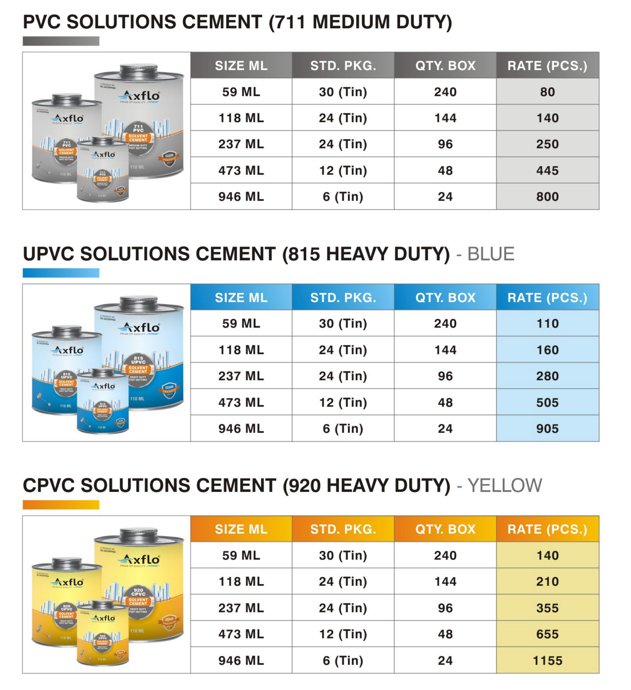 We are proud to offer a range of PVC solvent products that cater to different plumbing needs. Whether you need a fast-drying solvent or one that works well in cold temperatures, we have the perfect solution for you. Our products come in different sizes to cater to your specific needs.